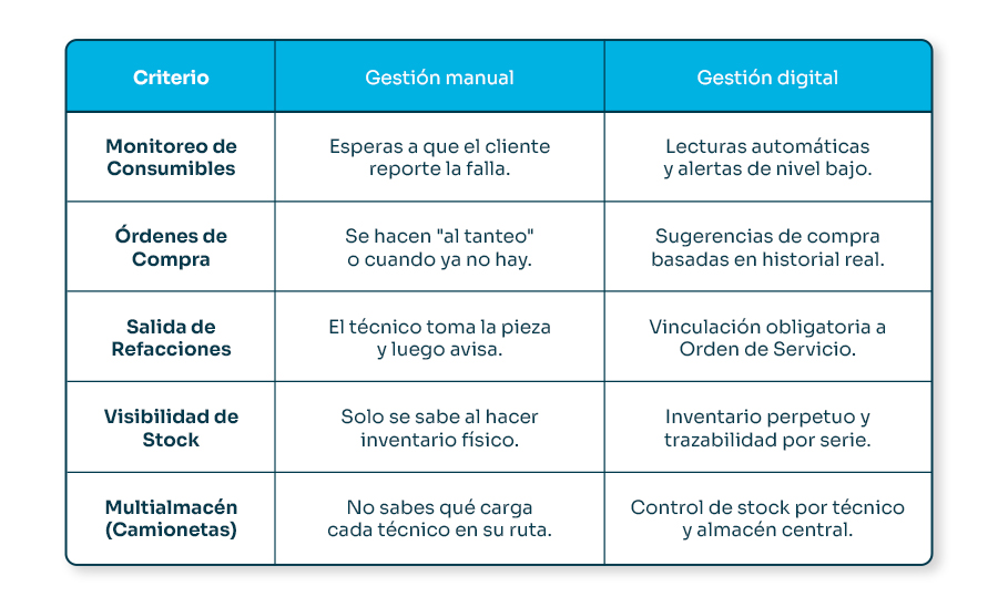 Si tu técnico de reparación en campo no sabe con certeza qué carga en su camioneta, y tu administrador no tiene alertas de lo que está por agotarse según el volumen de impresión real de tus clientes. Literalmente estás operando a ciegas.